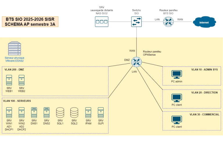 • Réseau d’entreprise complet : AD, DHCP, DNS, FOG, GLPI, WSUS